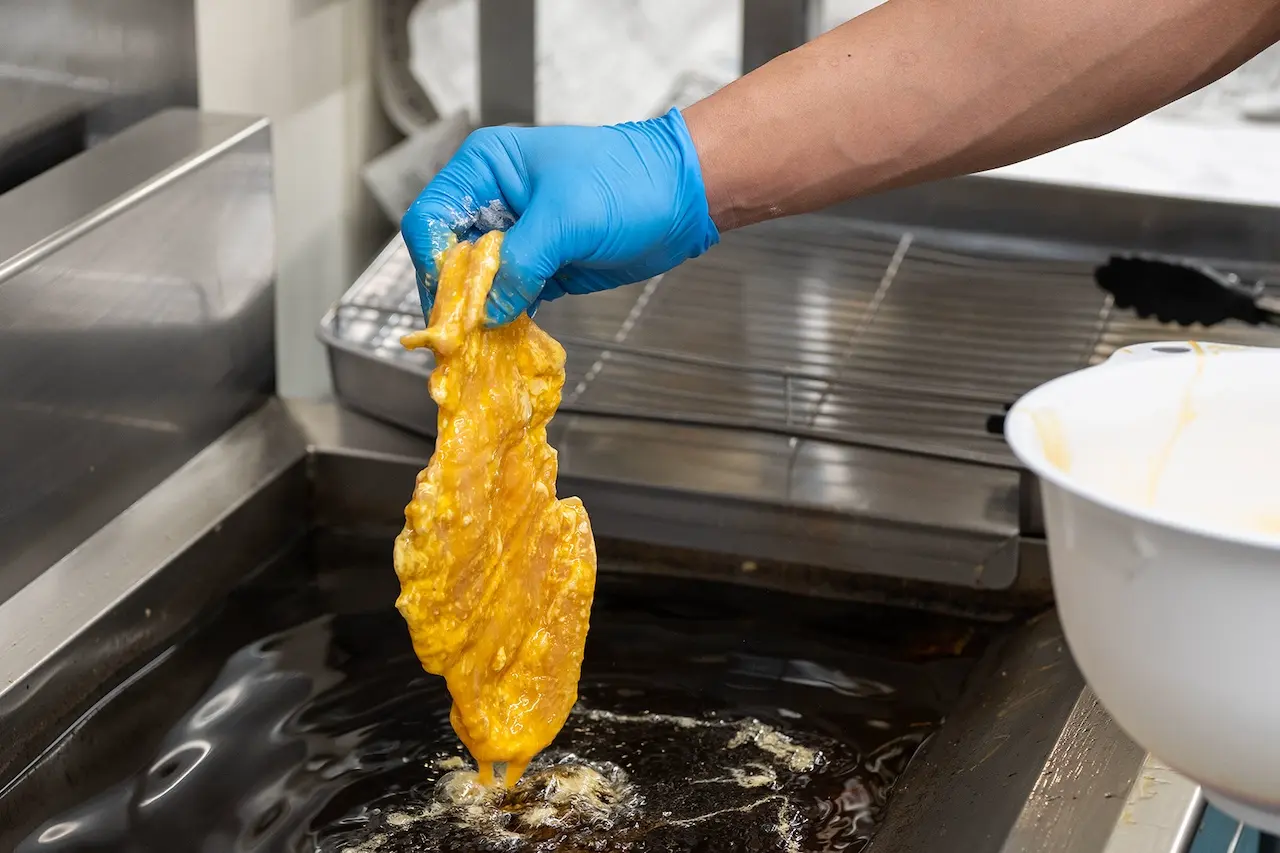 - 九州産の鶏むね肉を使用し、一枚一枚店内で丁寧に手揚げしています。たっぷりの卵を絡めて、しっとりやわらかく仕上げました。揚げたてをすぐに真空パックし、最適なタイミングで冷凍するとことで、衣の食感と旨みをそのまま閉じ込めています。